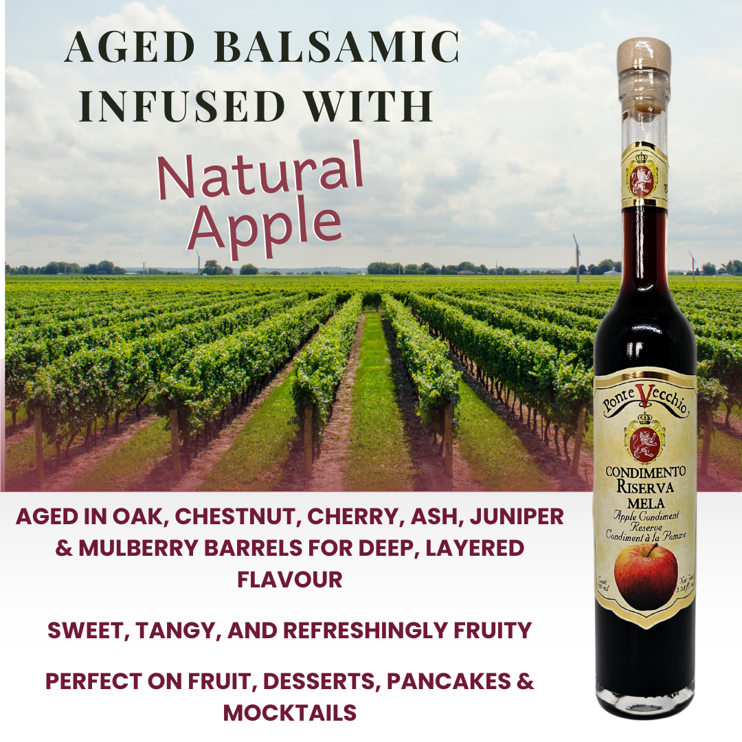 This versatile apple-infused balsamic is ready to enhance a wide range of dishes. Drizzle over cheeses to create a delightful contrast of flavours or use it to elevate desserts with its sweet and tangy notes. It pairs beautifully with ice cream and yogurt, adding a touch of sophistication to both. Its balanced profile makes it a perfect finishing touch for any dish, bringing a fresh, fruity depth to your culinary creations.
