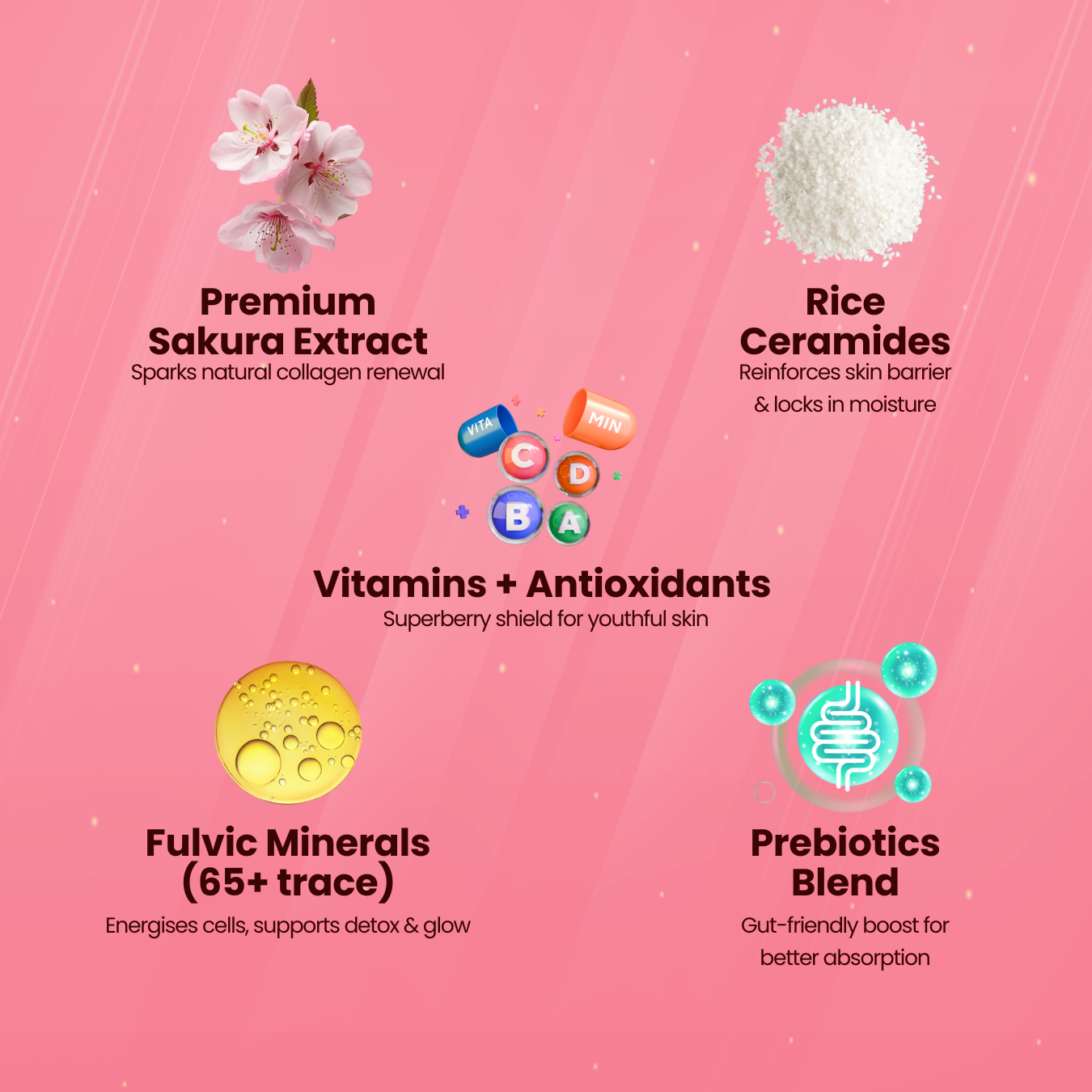 Wheat Dextrin (Soluble Fibre), Vitamin C, Prebiotics (Inulin), Berries (Raspberry, Blackberry, Blueberry & Elderberry), Fulvic Minerals, Sakura Extract, Ceramides (Rice Derived), Monk Fruit (Luo Han Guo) Extract