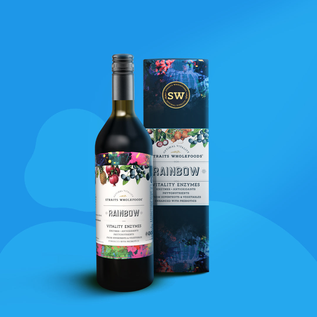 Straits Wholefoods Rainbow Vitality Enzymes is a highly concentrated bio-fermented botanical extract made from a rainbow spectrum of super fruits and vegetables: pineapples, carrots, soursop, apples, pomegranates, noni, mulberries, mangosteen, blueberries, cranberries and liquorice.